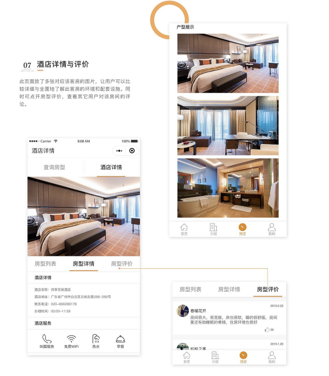 在线预约,用户出行前,可以提前在小程序上预约好居住的酒店,想比线下实地考察来说更加方便,又可以全面了解房型、价格、环境、地理位置是否好等等。